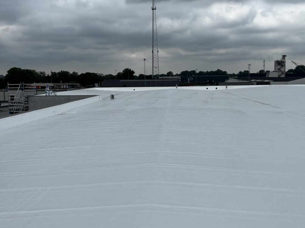 20 jaar verlenging van levensduur platte daken , hoger opbrengst zonnepanelen. Verlaagd energiekosten van airco’s, verkoeld daken van 80°C naar 40°C. Naadloos 100% waterdicht.